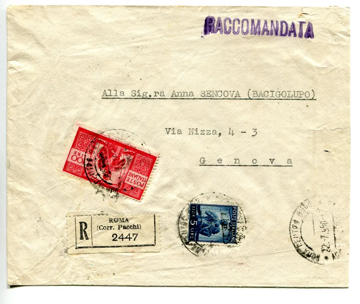 Democratica Lire 100 + Ergänzung Nr. 555 auf Umschlag Racc. von Rom nach Genua am 22.7.50 - im Tarif drei Häfen Nr. 809/A