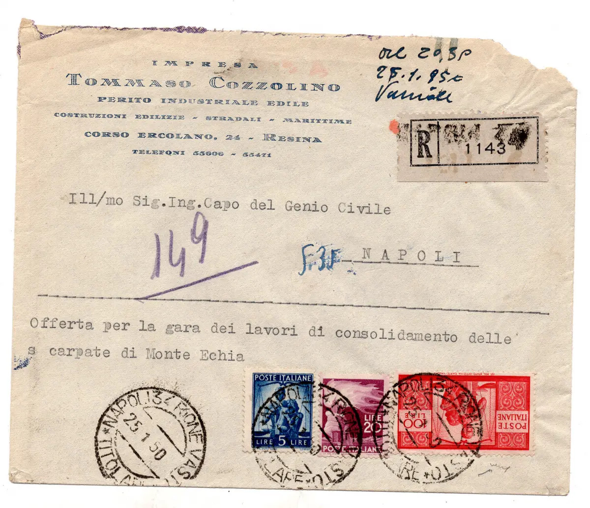Democratica Lire 100 Nr. 565 (II. Platte) Ihren Umschlag Racc. exp. von Neapel nach Stadt am 24.1.50 mit Ergänzungen Nr. 555 + 561 - Uncommon - CH Cod. 633/19