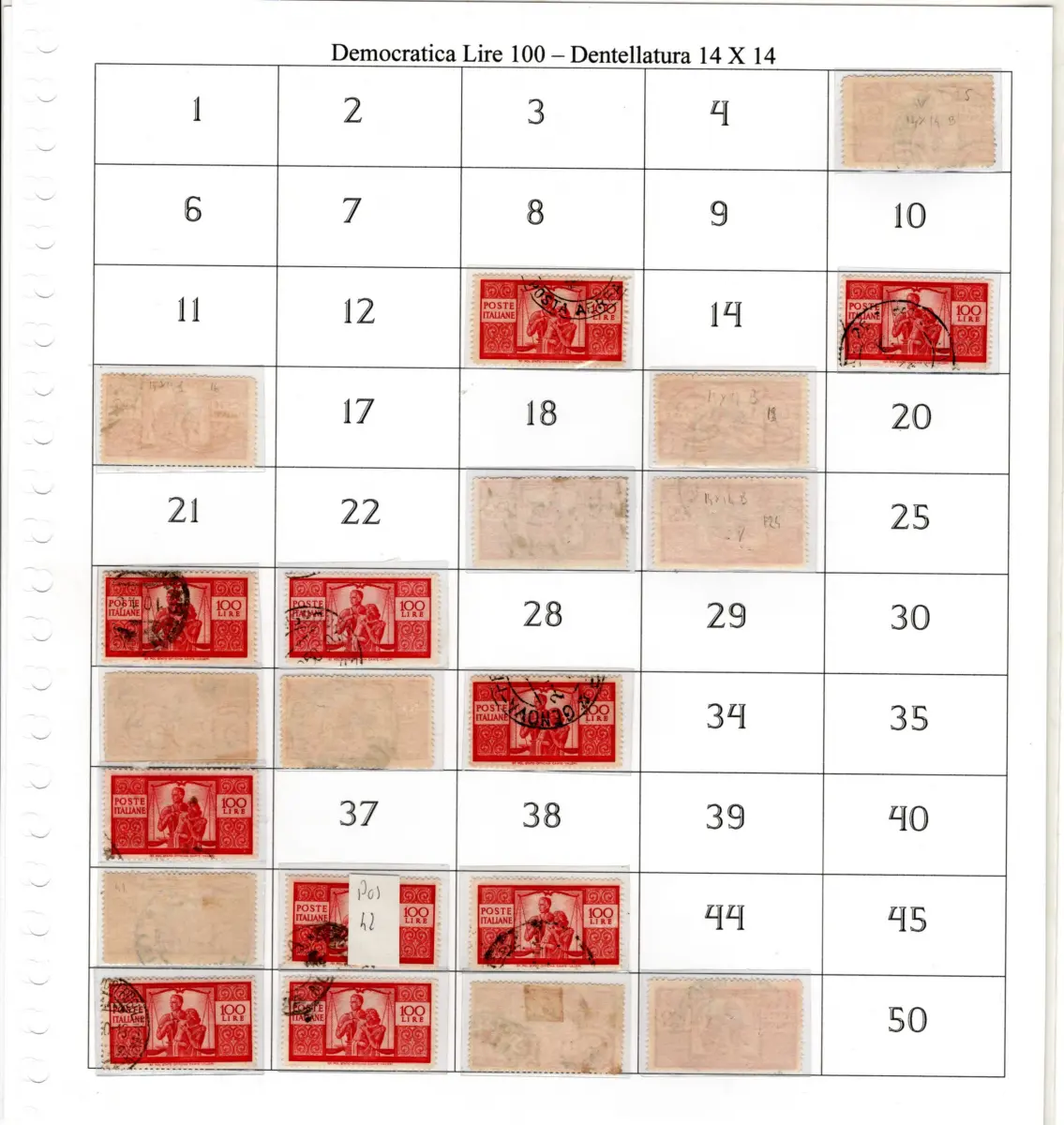 GEBRAUCHT - Democratica Lire 100 Nr. 565 zweite Verzahnungsplatte 14 (Sass. spec. n. 23/I) - 100 Lire Platte B plattiert, Sammelbeginn bestehend aus Nr. 42 verschiedenen Exemplaren je Position im Blatt alle plattiert - Bei unserer Prüfung finden wir 19 perfekte Exemplare und weitere 23 mit mehr oder weniger offensichtlichen Verzahnungsfehlern - Unser Verkaufsvorschlag wurde mit einer Bewertung von ca. 10 Euro je festgelegt. die perfekten Exemplare - Tolle Gelegenheit, diese faszinierende Sammlung zu starten Cod.578/182