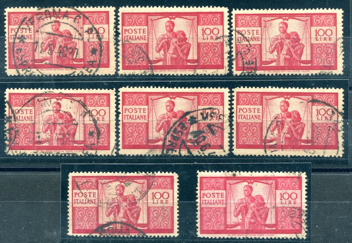 Democratica Lire 100 Nr. 565 (Erstplatte) Sechs gebrauchte Exemplare - Wasserzeichen in NS-Position Verzahnung 14 x 13 1/4 + zwei Sorten Doppelgravur - sehr gute Qualität - schöne intime Nr. 435/L