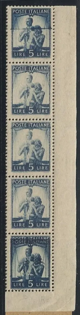 Democratica Lire 5 mit unvollständigem Druck Vollgummi - Democratica Lire 5 Nr. 555 vertikaler Streifen von 10 Exemplaren a. von f., davon 4 mit unvollständigem Druck (Nr. 555g) und das letzte Exemplar mit Doppeldruck (Nr. 555f) - Interessant - Kat. euro 1.000++ Code 450/7