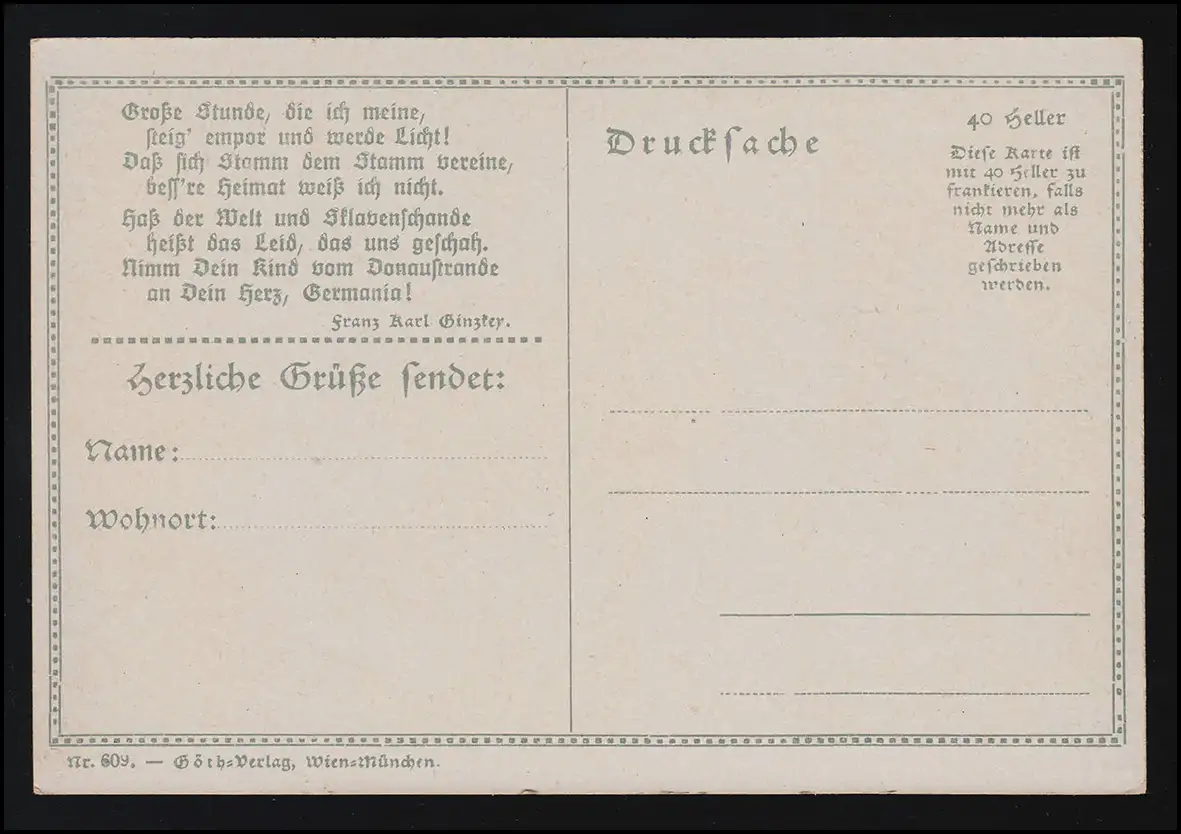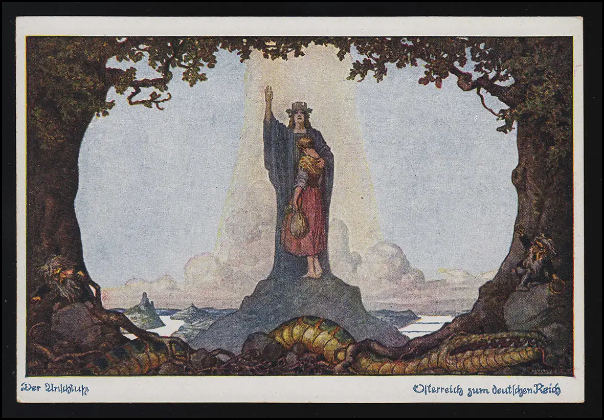 Propaganda Karte zum Anschluss Österreichs ans Deutsche Reich aus dem Göth Verlag Wien /München. Auf der Rückseite Verse von Franz Karl Ginzkey. Motiv ist die Germania die ihr "Kind" Österreich im Arm hält.