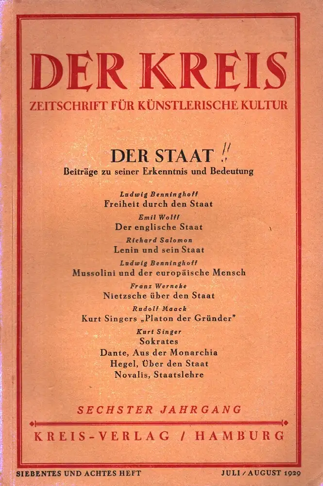 Titel: Der Kreis. Zeitschrift für künstlerische Kultur. JG 6, HEFT 7/8 | Juli/August 1929: Der Staat - Beiträge zu seiner Erkenntnis und Bedeutung. . (Hrsg. von Ludwig Benninghoff u. Wilhelm Postulart)