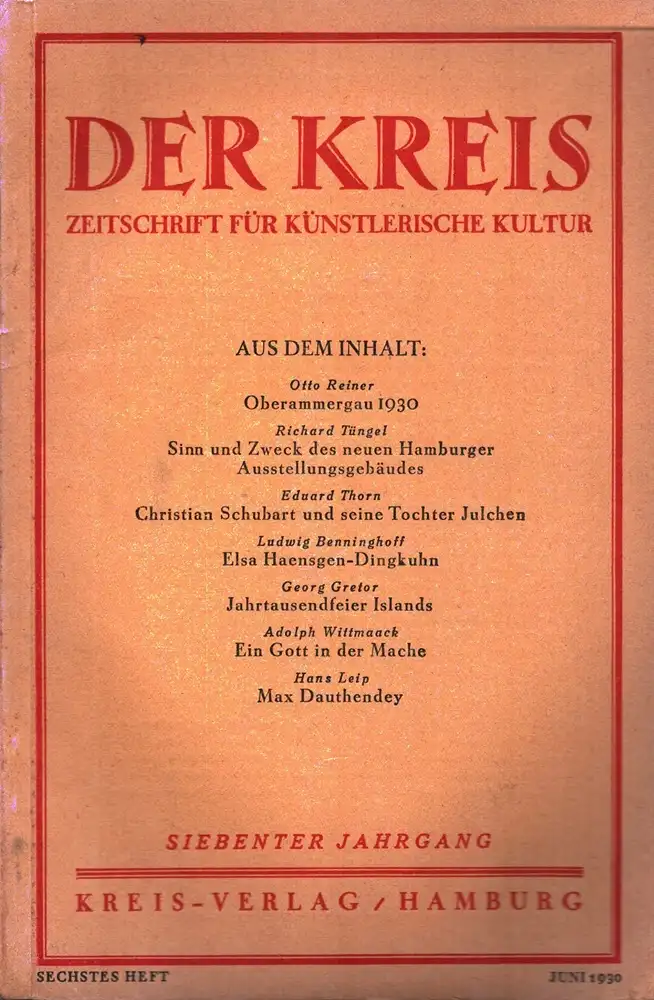 Darin: Otto Reiner, Oberammergau 1930. Richard Tüngel, Sinn und Zweck des neuen Hamburger Ausstellungsgebäudes. Eduard Thorn, Christian Schubart und seine Tochter Julchen. Ludwig Benninghoff, Elsa Haensgen-Dingkuhn. Walter Seidl, Das Untier Wagner. Ernst Schäfer, Wagners Leitmotiv und Psychologie. Georg Gretor, Jahrtausendfeier Islands. Ludwig Benninghoff, Island. Ilse Haalck, Engel Lund. - Papier mit schmalem Wasserrand, insgesamt ordentlich