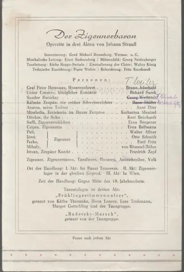Titel: Anhaltisches Landestheater Dessau. Bestzungsliste zu: Der Zigeunerbaron ( Johann Strauß ). - Spielzeit 1947 / 1948. - Inszenierung: Gerd Michael Henneberg. - Bühnenbild: Georg Neidenberger. - Mitwirkende: T. Weiler ( statt Bruno Aderhold ), Richard Surek, F. Lehnert ( statt Georg Weiland ), Herbert Albes ( statt Hans Müller ), Anni Dörr, Katharina Mentzel, Friedrich Zapf u. a.