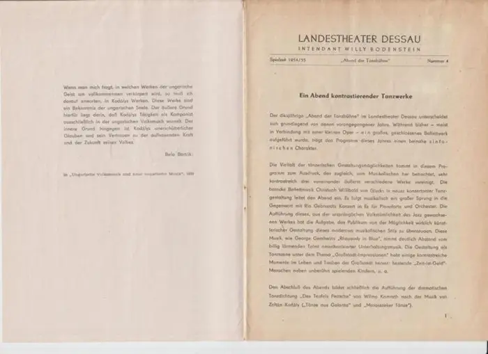 Titel: Landestheater Dessau. Heft 4 der Spielzeit 1954 / 1955: Abend der Tanzbühne. - Programm: Tanzsymphonie von Gluck / Großstatdt-Impressionen. Tanzszene von W. Kamrath mit Musik von Rio Gebhard ( Uraufführung / Des Teufels Peitsche ( Szenische Uraufführung ): Dramatische Tanzdichtung von W. Kamrath mit Musik von Zoltan Kodaly. - Inszenierung und Choreographie: Wilmo Kamrath. - Bühnenbild und Kostüme: Manfred Schröter. - Mitwirkende: Ellen meißner, Wolfgang Winter, Brigitte Thom, Otto Schaper, Heinz Tegeler, Monika Naumann u. a. - Am Flügel: Wolfgang Schmorl.