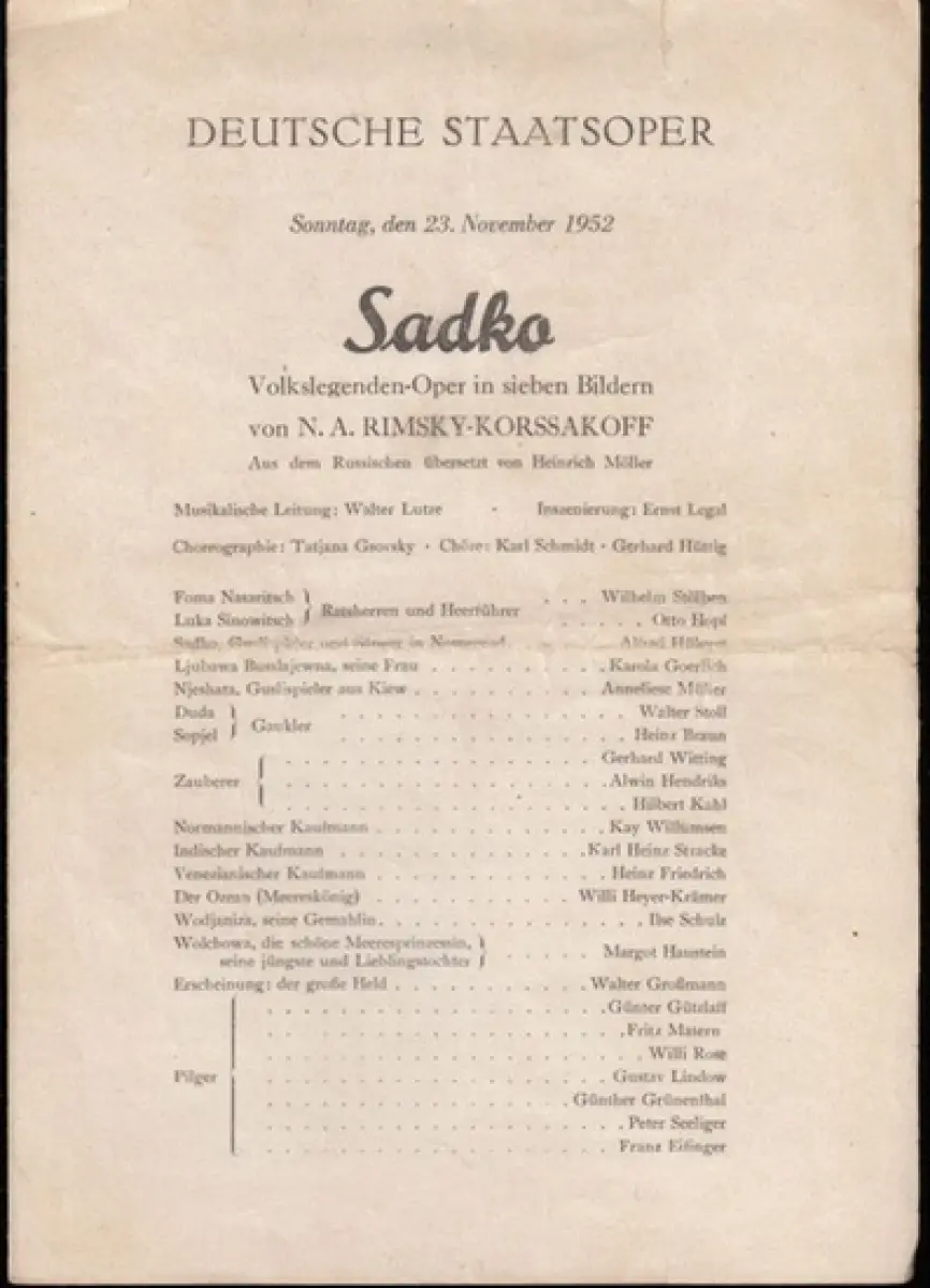 Deutsch Staatsoper Berlin. - N. A. Rimsky-Korssakoff: Programmzettel zu: Sado. Volkslegenden-Oper von N. A. Rimsky-Korssakoff. - Musikalische Leitung: Walter Lutze. - Inszenierung: Ernst Legal. - Choreographie: Tatjana Gsovsky. - Mit: Wilhelm Stölben, Ott