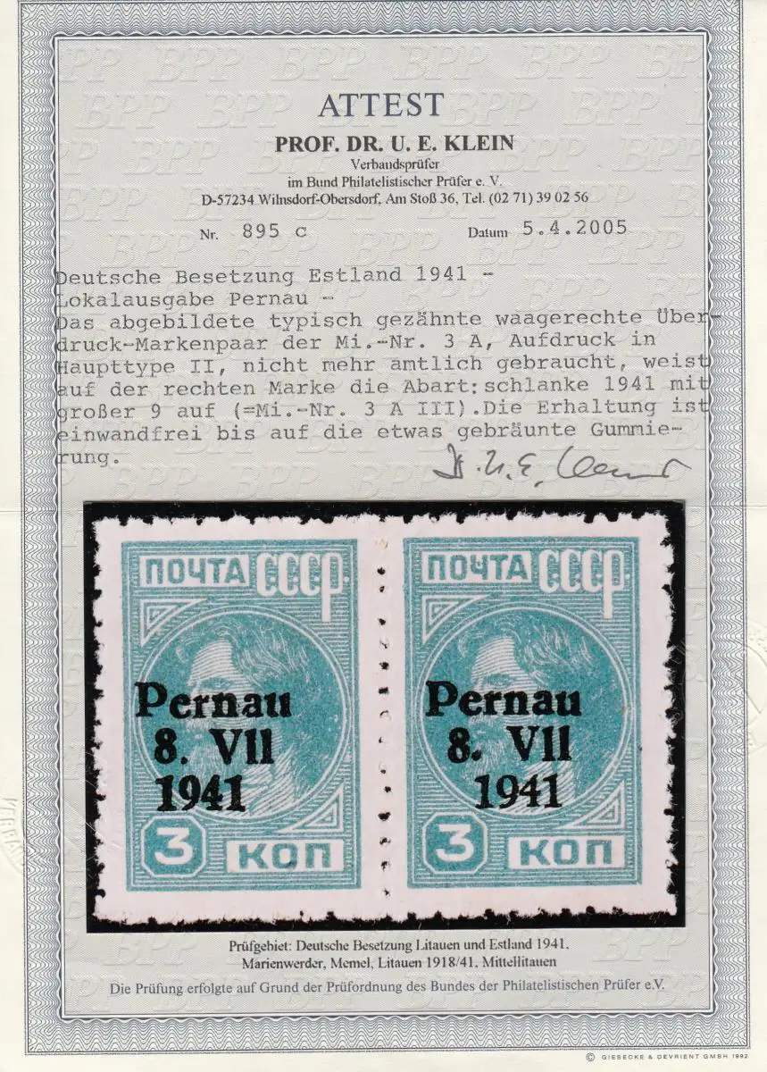 Deutsche Besetzung Estland 1941: MiNr. 3A Aufduck II, Plattenfehler, BPP Attest
