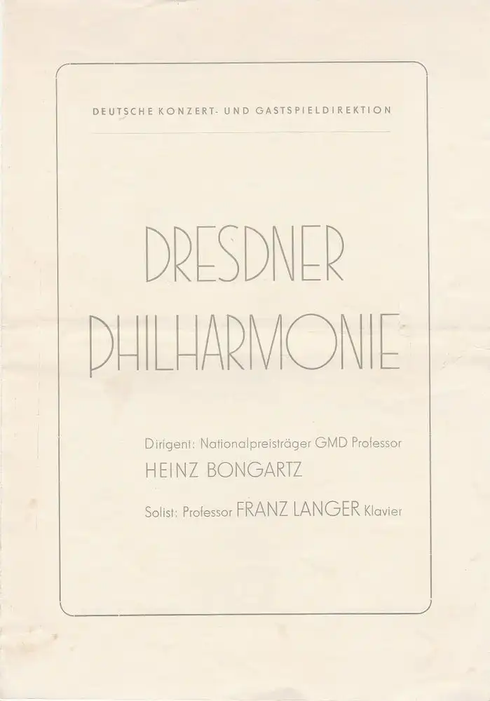 Deutsche Konzert- und Gastspieldirektion: Programmheft DRESDNER PHILHARMONIE DIRIGENT HEINZ BONGARTZ ca. 1954.