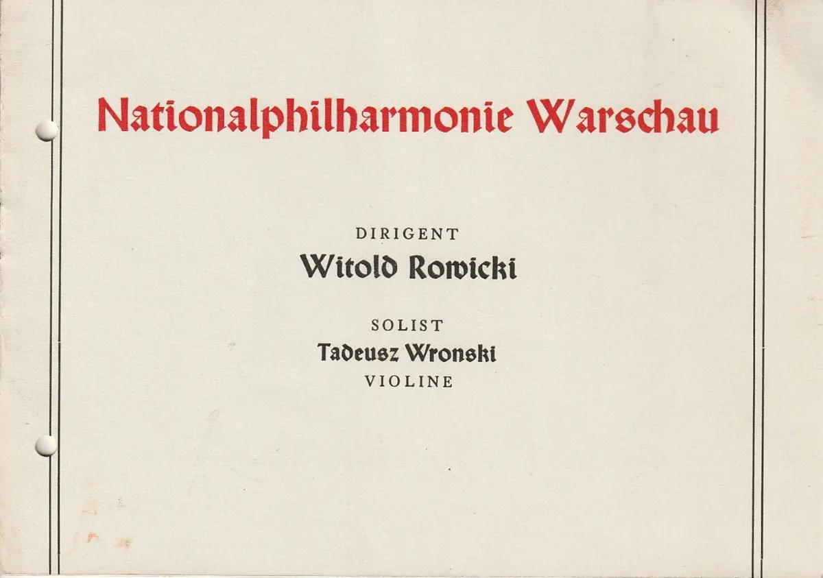Dirigent: Witold Rowicki. Solist: Tadeusz Wronski ( Violine ). Programm: Hanns Eisler: Allegro für Orchester / Tadeusz Baird: Vier Essays für Orchester / Karol Szymanowski: Konzert für Violine und Orchester Nr. 1 op. 35 / Dmitrij Schostakowitsch: Sinfonie Nr. 5 op. 47 - Theaterprogramm, Opernprogramm, Ballettprogramm, Musicalprogramm, Konzertprogramm, Theatermemorabilia, Programmhefte Sammlung, deutsche Theatergeschichte.