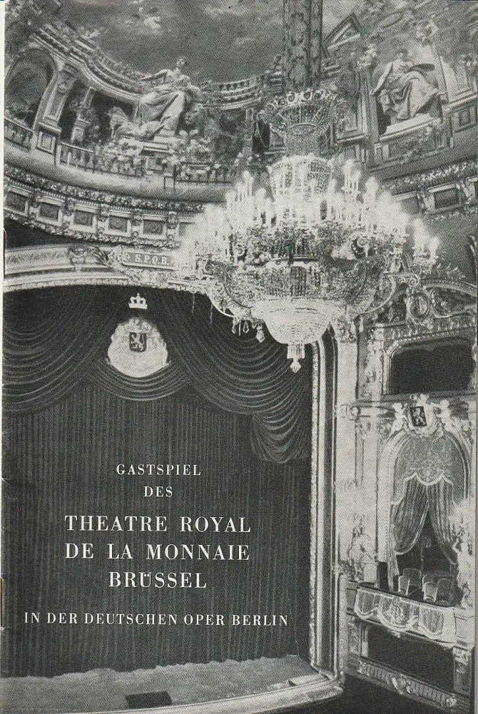 original Heft, nicht paginiert, 28 Seiten, Kurzbiographien der Künstlern der Belgischen Staatsoper, beiliegendes Blatt mit Fotos dazu, Szenenfotos zur Aufführung sowie zu Ballett: Stücke für Orchester,Serenade, Divertimento, Le sacre du Printemps, Hoffmanns Erzählungen und La Traviata Zustand:gut, einige Seiten mit Faltspur an einer Ecke
