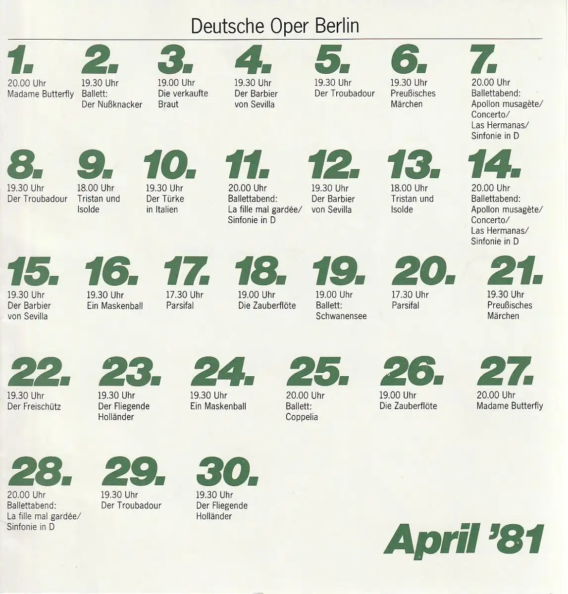 original Heft, Format ca. 21 x 20 cm, nicht durchgängig paginiert, diverse Abbildungen, Besetzungsliste vom 21. April 1981 ( 28. Aufführung ). Zustand: sehr gut