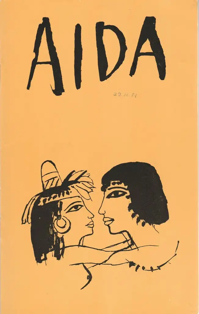 Oper in vier Akten von Antonio Ghislanzoni. Musikalische Leitung: Wolfgang Rennert. Inszenierung: Erhard Fischer. Gesamtausstattung: Wilfried Werz. Choreographie: Dietmar Seyffert. Mitwirkende: Heinz Reeh, Gisela Schröter, Enriqueta Tarres, Ruggiero Orofino, Fritz Hübner, u. a. - Theaterprogramm, Opernprogramm, Ballettprogramm, Musicalprogramm, Konzertprogramm, Theatermemorabilia, Programmhefte Sammlung, deutsche Theatergeschichte.