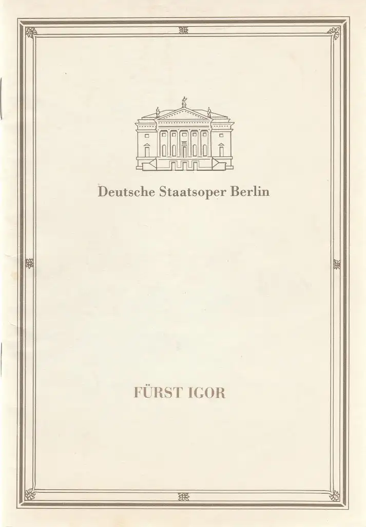 Oper in vier Akten, einem Prolog und einem Epilog. Libretto auf der Grundlage des russischen Epos Das Lied von der Heeerfahrt Igors ( Fassung Möller ). Musikalische Leitung: Walter Weller. Inszenierung: Christian Pöppelreiter. Bühne: Wilfried Werz. Kostüme: Christine Stromberg. Choreographie: Roland Gawlik, Mitwirkende: Jürgen Freier, Magdalena Hajossyova, Wolfgang Millgramm, Rene Pape, Fritz Hübner, Dagmar Peckova, u. a. - Theaterprogramm, Opernprogramm, Ballettprogramm, Musicalprogramm, Konzertprogramm, Theatermemorabilia, Programmhefte Sammlung, deutsche Theatergeschichte.