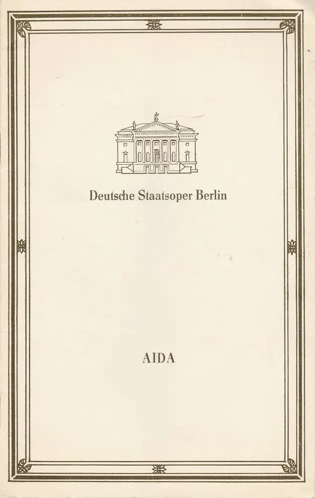 Oper in vier Akten von Antonio Ghislanzoni. In Originalsprache. Musikalische Leitung: Wolfgang Rennert. Inszenierung: Erhard Fischer. Gesamtausstattung: Wilfried Werz. Choreographie: Dietmar Seyffert. Mitwirkende: Rene Pape, Uta Priew, Pauletta DeVaughn, Bruno Sebastian, Fritz Hübner, u. a. - Theaterprogramm, Opernprogramm, Ballettprogramm, Musicalprogramm, Konzertprogramm, Theatermemorabilia, Programmhefte Sammlung, deutsche Theatergeschichte.