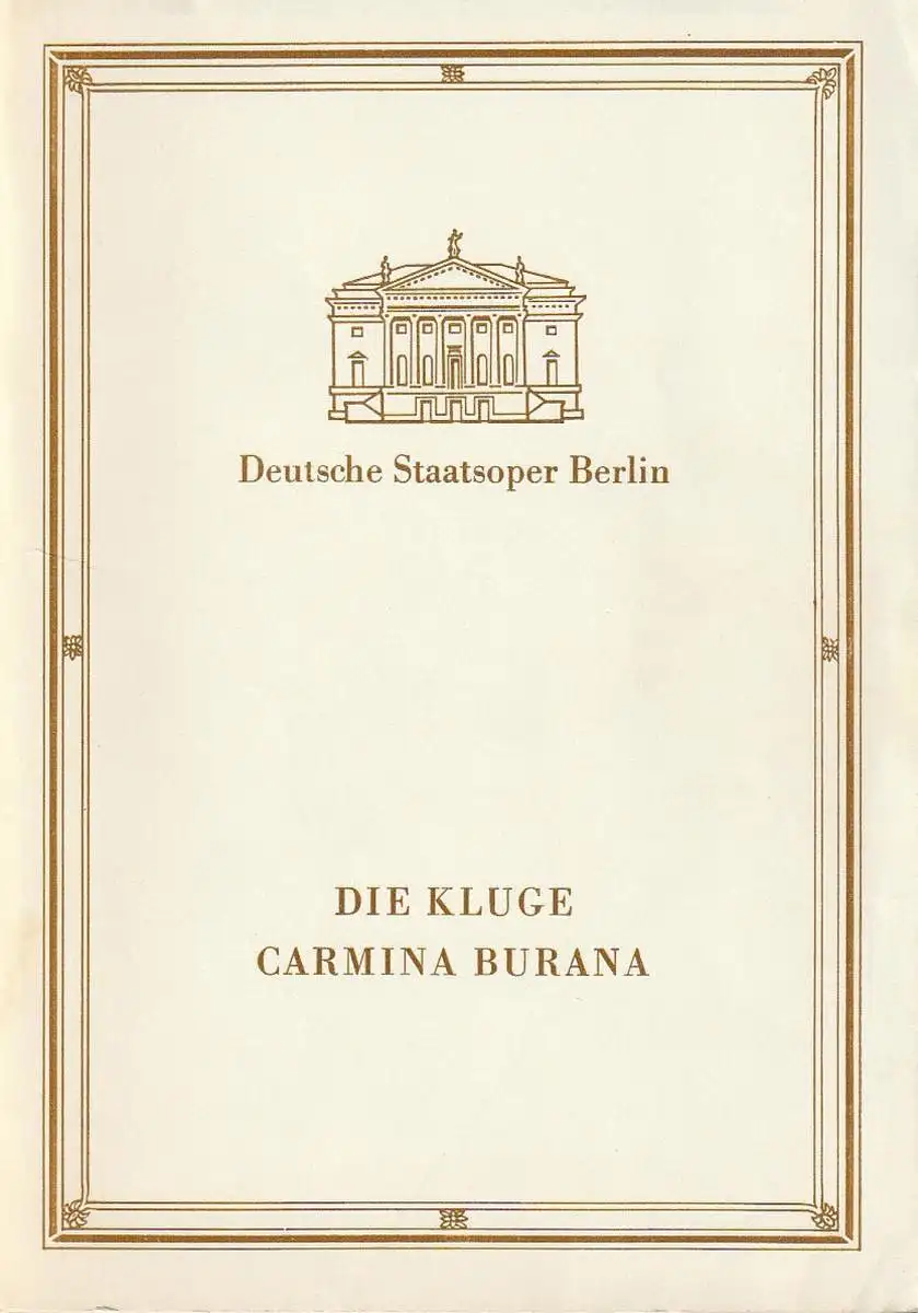 DIE KLUGE: Musikalische Leitung: Jörg Krüger. Inszenierung: Horst Bonnet. Ausstattung: Wilfried Werz. Choreographie: Roland Gawlik. Mitwirkende: Bernd Zettisch, Gerd Wolf, Carola Nossek, Heinz Reeh, Peter Bindszus, Rolf Haunstein, u. a. CARMINA BURANA: Musikalische Leitung: Heinz Panzer. Inszenierung und Choreographie: Youri Vamos. Bühne: Dieter Lange. Kostüme: Christine Stromberg. Es singen: Isabella Nawe, Henno Garduhn, Rolf Haunstein. Staatsoperchor und Kinderchor der Deutschen Staatsoper. Es tanzen: Bettina Thiel, Raimondo Rebeck, Birgit Brux, Ralf Stengel, Torsten Händler, Uwe Arnold, Dietmar Jacob, u. a. - Theaterprogramm, Opernprogramm, Ballettprogramm, Musicalprogramm, Konzertprogramm, Theatermemorabilia, Programmhefte Sammlung, deutsche Theatergeschichte.