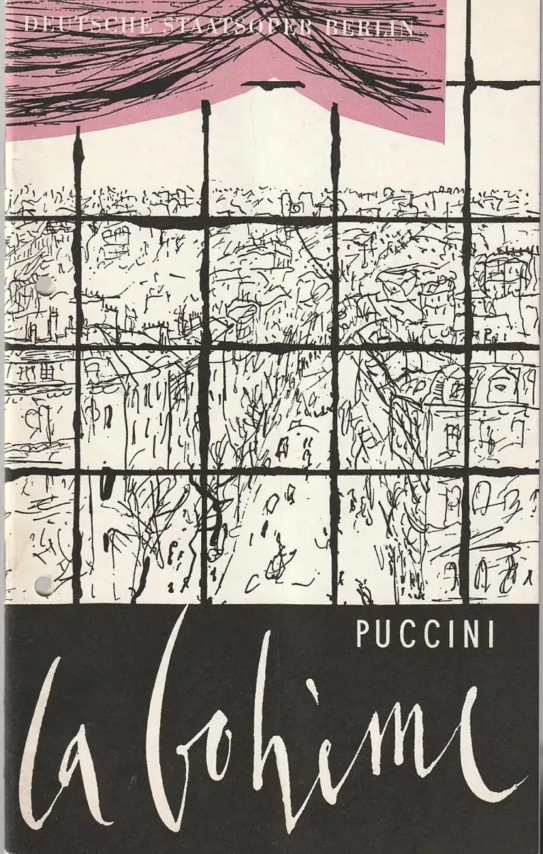 Szenen aus dem Leben der Boheme von Henry Murger in vier Bildern. Musikalische Leitung: Joachim Freyer. Inszenierung: Erhard Fischer. Bühne: Paul Pliowski. Kostüme: Christine Stromberg. Mitwirkende: Ruggiero Orofino, Horst Lunow, Rolf Kühne, Hans-Joachim Lukat, Günther Fröhlich, Celstina Casapietra, Renate Hoff, u. a. - Theaterprogramm, Opernprogramm, Ballettprogramm, Musicalprogramm, Konzertprogramm, Theatermemorabilia, Programmhefte Sammlung, deutsche Theatergeschichte.