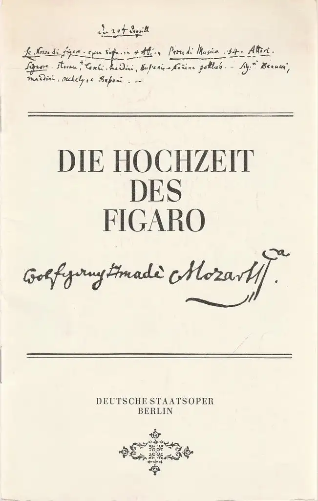 oder Der tolle Tag. Komödie für Musik in vier Akten. Musikalische Leitung: Otmat Suitner. Inszenierung: Theo Adam. Bühne: Wilfired Werz. Kostüme: Erika Simmank-Heinze. Mitwirkende: Ludwig Baumann, Magdalena Hajossyova, Carola Nossek, Siegfried Vogel, Uta Priew, u. a. - Programmhefte24 - Programmhefte für Theater, Oper & Ballett.
