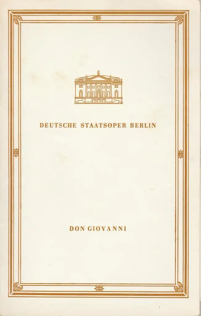 original Heft, Format ca. 14,5 x 22,5 cm, nicht paginiert, ca. 24 Seiten, Beiträge, einige Abbildungen, darunter ein Bühnenbildentwurf und ein Figurinenentwurf des Don Giovanni von Gerd Richter, beiliegende Besetzungsliste. Zustand: gut, Deckel und Rückseite etwas begriffen