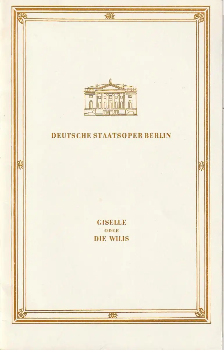 oder DIE WILIS. Phantastisches Ballett in zwei Akten von Theophile Gautier und Jules Henri Vernoy de Saint-Georges. In der Originalchoreographie von Jules Perrot und Jean Coralli. Neueinstudiert von Galina Kusnetzowa. Solobratsche: Walter Müller. Bühne: Paul Pilowski. Kostüme: Christine Stromberg. Staatskapelle Berlin. Musikalische Leitung: Werner Stolze. Mitwirkende: Monika Lubitz, Annelies Kiontke, J. Hanus Sklenar, Klaus Galler, Harry Müller, Karl Maschwitz, Ursula Fischer, u.a. - Theaterprogramm, Opernprogramm, Ballettprogramm, Musicalprogramm, Konzertprogramm, Theatermemorabilia, Programmhefte Sammlung, deutsche Theatergeschichte.