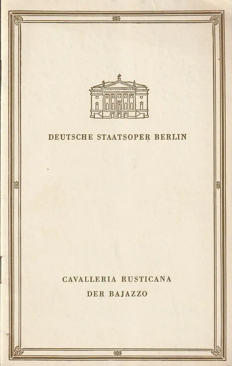 Musikalische Leitung: Horst Stein. Inszenierung: Erich Witte. Bühne und Kostüme: Edmund Erpf. Asssistenz: Peter Neitsch. CAVALLERIA RUSTICANA : Oper in einem Aufzug von Pietro Mascagni. Mitwirkende: Hedwig Müller-Bütow, Helmut Meinokat, Gertrud Stilo, Gerhard Niese, Erna Roescher. DER BAJAZZO: Drama in zwei Akten und einem Prolog. Text und Musik: Ruggiero Leoncavallo. Mitwirkende: Helge Rosvaenge, Maria Corelli, Frans Andersson, Gerhard Stolze, Hans Georg Nowotny, Günter Gützlaff. - Theaterprogramm, Opernprogramm, Ballettprogramm, Musicalprogramm, Konzertprogramm, Theatermemorabilia, Programmhefte Sammlung, deutsche Theatergeschichte.