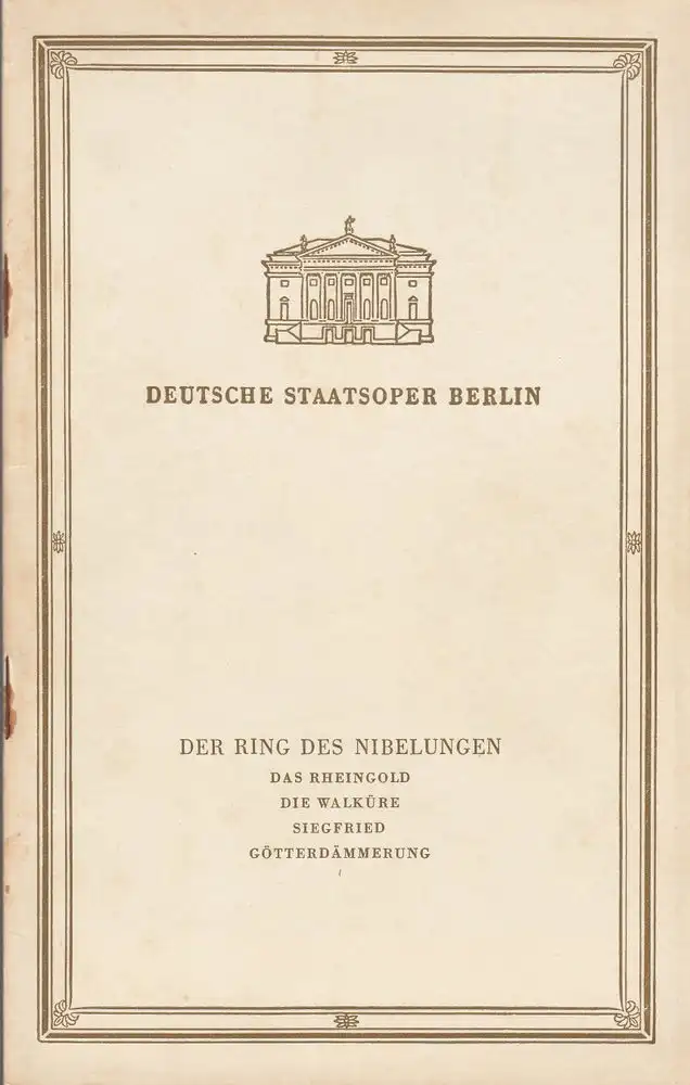 Musikalische Leitung: Franz Konwitschny. Inszenierung: Erich Witte. Bühne und Kostüme und Gesamtausstattung: Heinz Pfeiffenberger. Chöre: Karl Schmidt. Mitwirkende: Das Rheingold: Rudolf Gonszar, Robert Lauhöfer, Karl-Olof Johansson, Erich Witte, u. a.. Die Walküre: Günther Treptow, Ludwig Hofmann, Rudolf Gonszar, Sigrid Ekkhard, u. a. Siegfried: Günther Treptow, Gerhard Stolze, Rudolf Gonszar, Frans Andersson, u. a.. Götterdämmerung: Günther Treptow, Helena Braun, Ludwig Hofmann, Gerhard Niese, Frans Andersson, u. a. - Theaterprogramm, Opernprogramm, Ballettprogramm, Musicalprogramm, Konzertprogramm, Theatermemorabilia, Programmhefte Sammlung, deutsche Theatergeschichte.
