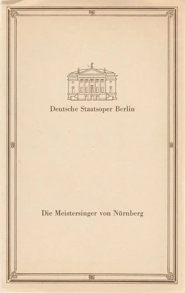 Musikalische Leitung: Heinz Fricke. Inszenierung: Werner Kelch. Bühne: Paul Pilowski. Kostüme: Christine Stromberg. Mitwirkende: Theo Adam, Siegfried Vogel, Henno Garduhn, Erich Siebenschuh, Siegfried Lorenz, Peter Olesch, Harald Neukirch ( für Peter Schreier ), u.a. - Theaterprogramm, Opernprogramm, Ballettprogramm, Musicalprogramm, Konzertprogramm, Theatermemorabilia, Programmhefte Sammlung, deutsche Theatergeschichte.