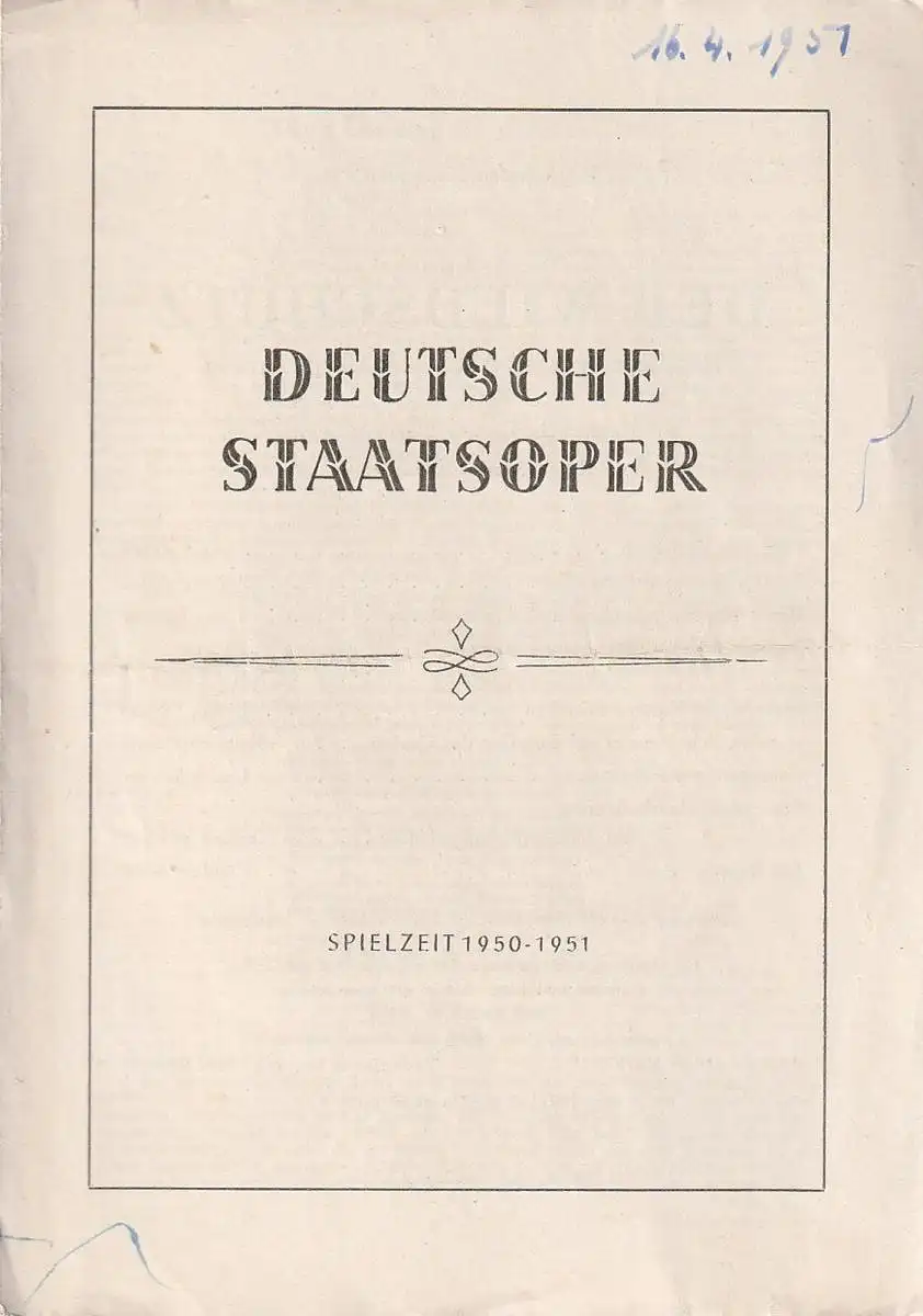 Deutsche Staatsoper: Theaterzettel Albert Lortzing DER WILDSCHÜTZ 16. April 1951 Spielzeit 1950 / 51.