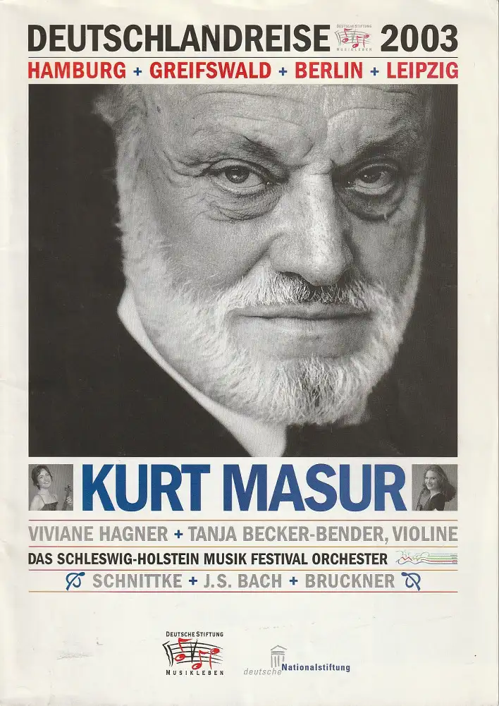 Spielorte: Hamburg St. Michaelis / Greifswald Dom St. Nikolai / Berlin Konzerthaus Berlin / Leipzig Gewandhaus. Programm: Arthur Schnittke / Johann Sebastian Bach / Anto Bruckner. Dirigent: Kurt Masur. Solisten: Viviane Hagner, Tanja Becker-Bender, Schleswig-Holstein Musik Festival Orchester - Theaterprogramm, Opernprogramm, Ballettprogramm, Musicalprogramm, Konzertprogramm, Theatermemorabilia, Programmhefte Sammlung, deutsche Theatergeschichte.