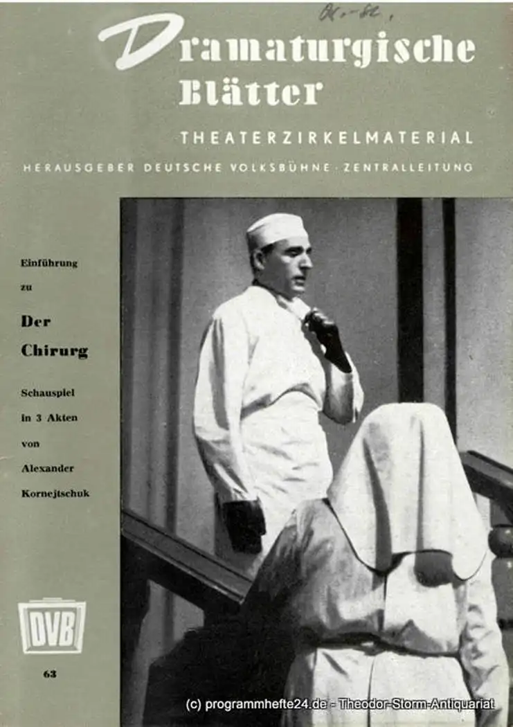 Deutsche Volksbühne Zentralleitung, Paul Dornberger: Dramaturgische Blätter. Einführung zu Der Chirurg. Schauspiel von Alexander Kornejtschuk. Theaterzirkelmaterial Nr. 63.