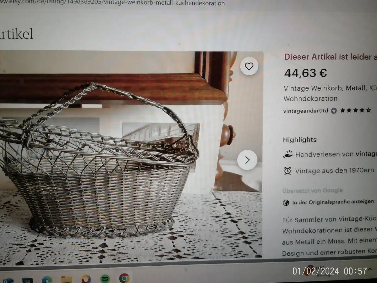 Für Sammler von Vintage-Küchen- und Wohndekorationen ist dieser Weinlagerungskorb aus Metall ein Muss. Mit einem klassischen Design und einer robusten Konstruktion ist es perfekt für die Präsentation Ihrer Lieblingsgegenstände oder für die Verwendung als funktionale Aufbewahrungslösung. Die einzigartige Form und der Stil dieses Korbes machen ihn zu einem herausragenden Stück und verleihen jedem Raum einen Hauch von Charme.