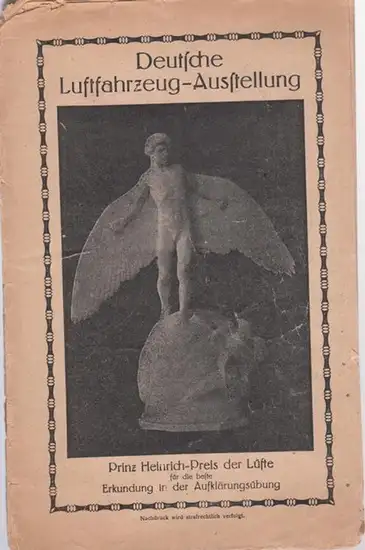 Freie Beschreibung: 22,2 x 14,4 cm. Original-Heft mit Deckblattabbildung ' Prinz Heinrich-Preis der Lüfte für die beste Erkundung in der Aufklärungsübung '. Das Exemplar mit kleineren Randläsionen, die ersten zwei Blatt und das hintere Deckblatt lose. 30, (2) Seiten mit einfarbigen Abbildungen und Auflistung und Beschreibung von 200 Positionen (Freiballone, Luftschiffe, Flugmaschinen, Wasserflugzeuge u.a.). Die letzten 2 Blatt mit einer Übersicht von Parseval-Luftschiffen (fertig oder im Bau befindlich)