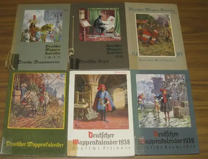 Titel: Deutscher Wappenkalender. 6 Kalender der Reihe, mit einer kompletten Folge der Jahre 1935 - 1939. Enthalten sind: 4. Jg. 1930 - Deutsche Staatsmänner / 9. Jg. 1935 - Deutsche Ärzte / 1936 - Deutsche Wettkämpfer / 1937 - Deutsche Weinhändler / 1938 - Deutsche Erfinder / 1939: Deutsche Baumeister. Mit bildlichem Schmuck von Gustav Adolf Cloß
