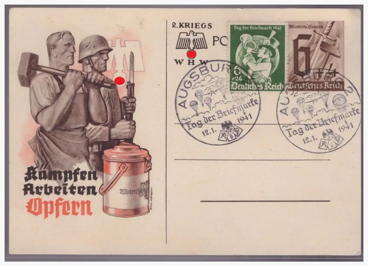 Dt- Reich (003948) Ganzsache P291, Kämpfen Arbeiten Opfern, blanco gestempelt mit SST Augsburg zum Tag der Briefmarke