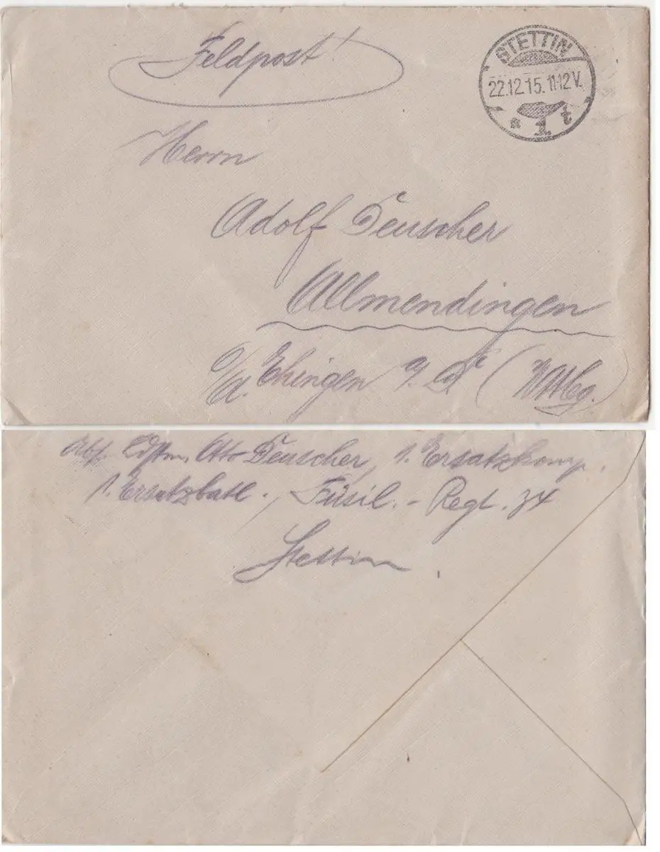Gelaufen am 22.12.1915 von Stettin nach Allmendingen