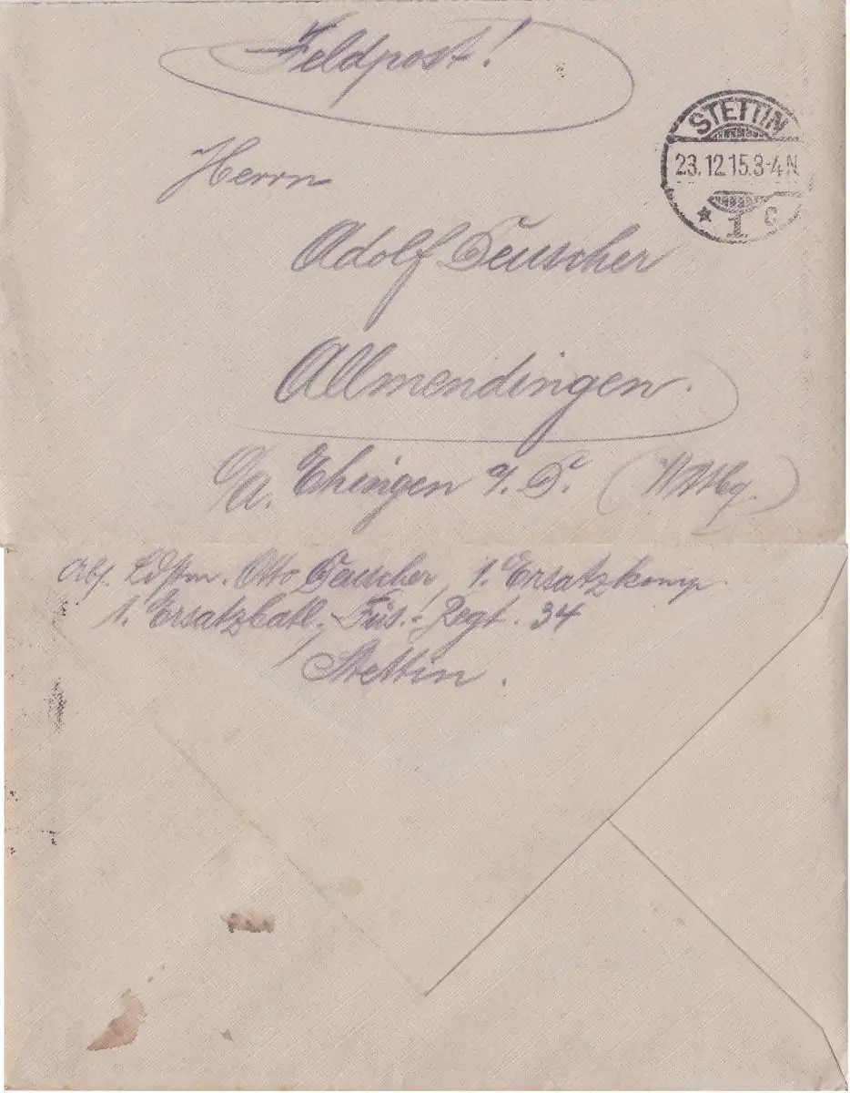 Gelaufen am 23.12.1915 von Stettin nach Allmendingen