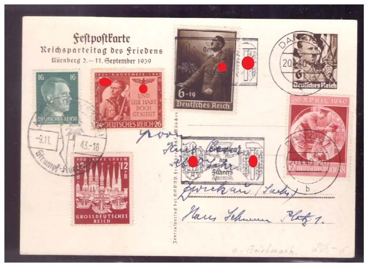 Dt.- Reich (021195) Propaganda Ganzsache Reichsparteitag des Friedens 1939, gelaufen mit diversen Marken und SST z.B
