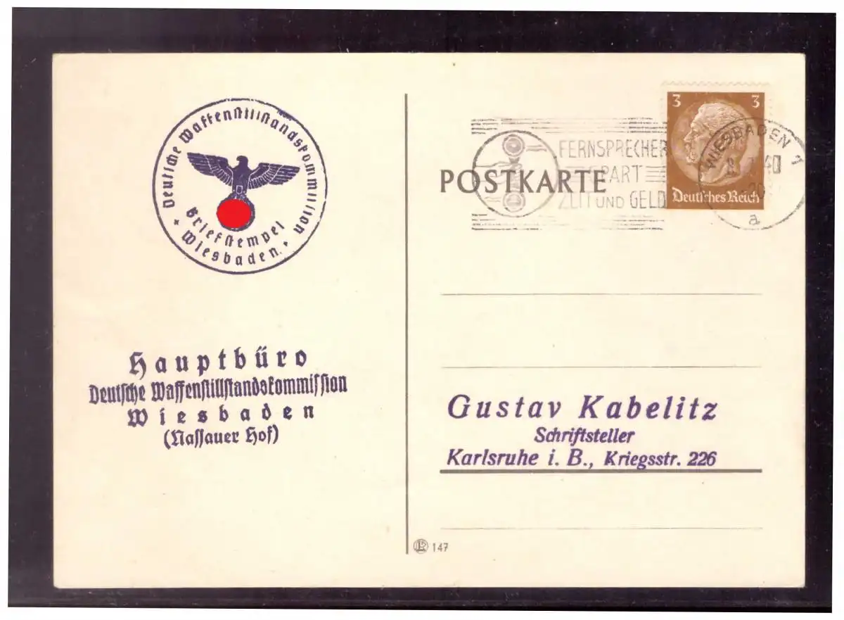 Dt-Reich (021239) Propaganda Postkarte mit Stempel Haupbüro Deutsche Waffenstillstandskommision Wiesbaden, gel. 1940