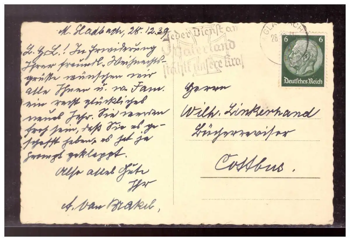 Dt- Reich (022243) AK Gladbach mit Werbestempel, Jeder Dienst am Vaterland stählt unsere Kraft, gel. Gladbach 28.12.1939