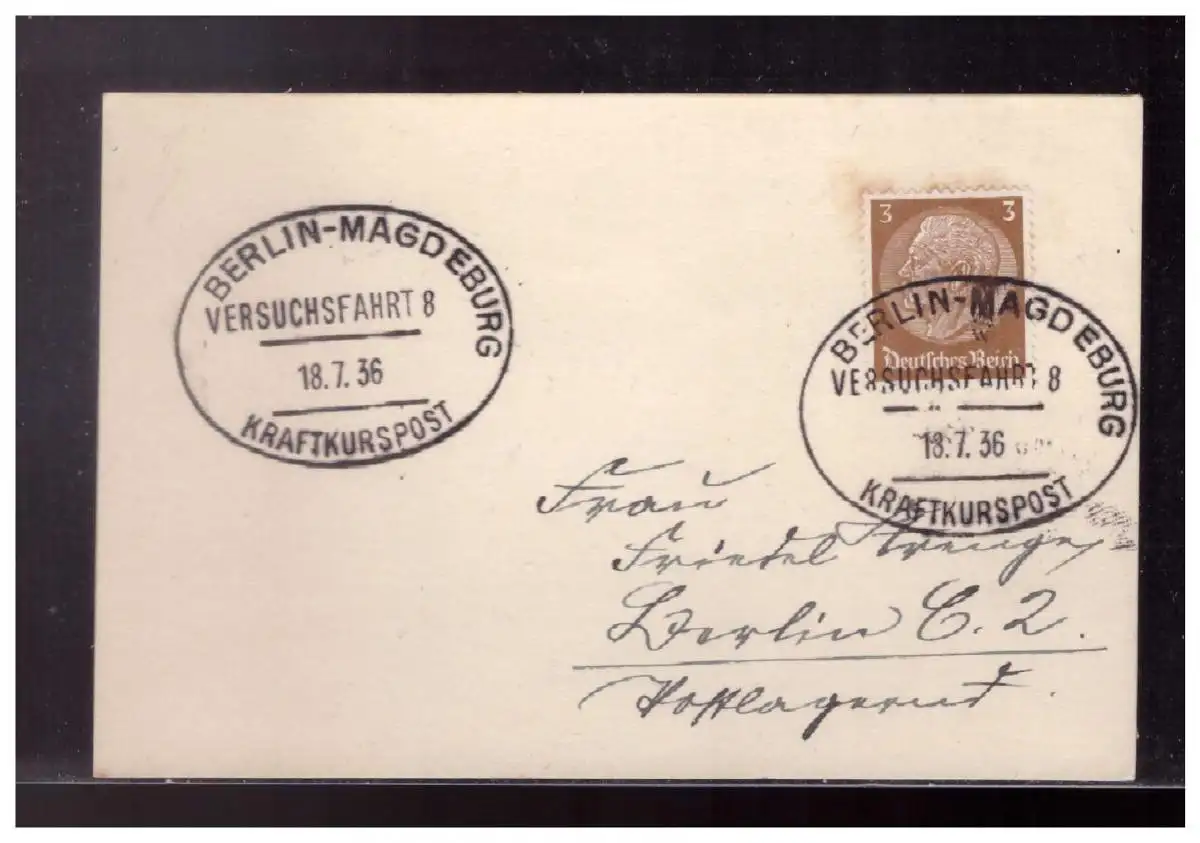 Dt- Reich (023707) Postkarte mit Sonderstempel Kraftkurspost Versuchsfahrt 8 Berlin - Magdeburg am 18.7.1936