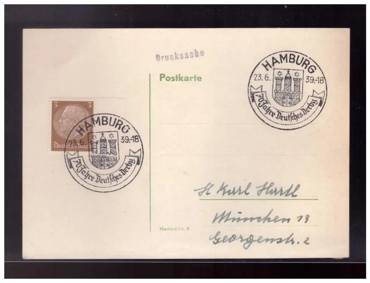 DT- Reich (023743) Postkarte mit Sonderstempel Hamburg, 70 Jahre Deutsches Derby vom 23.6.1939