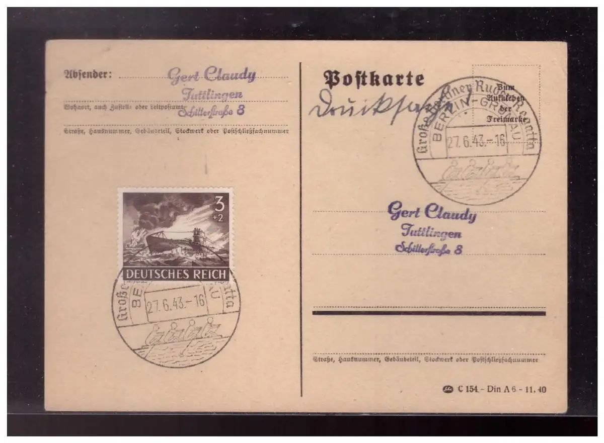 DT- Reich (023754) Postkarte mit Sonderstempel Berlin- Grünau Große Berliner Ruder Regatta vom 27.6.1943