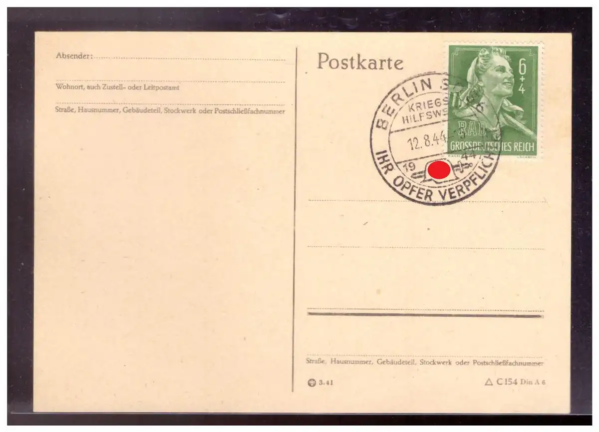 Dt- Reich (022236) Postkarte blanco mit Sonderstempel Berlin, Ihr Opfer verplichtet vom 12.8.1944