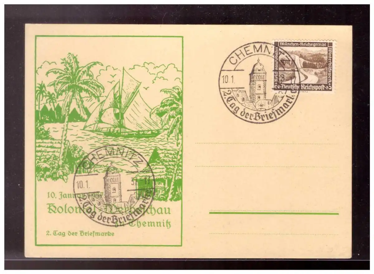 Dt- Reich (022541) Postkarte Kolonial Werbeschau zu Chemnitz 2. Tag der Briefmarke, blanco gestempelt mit SST