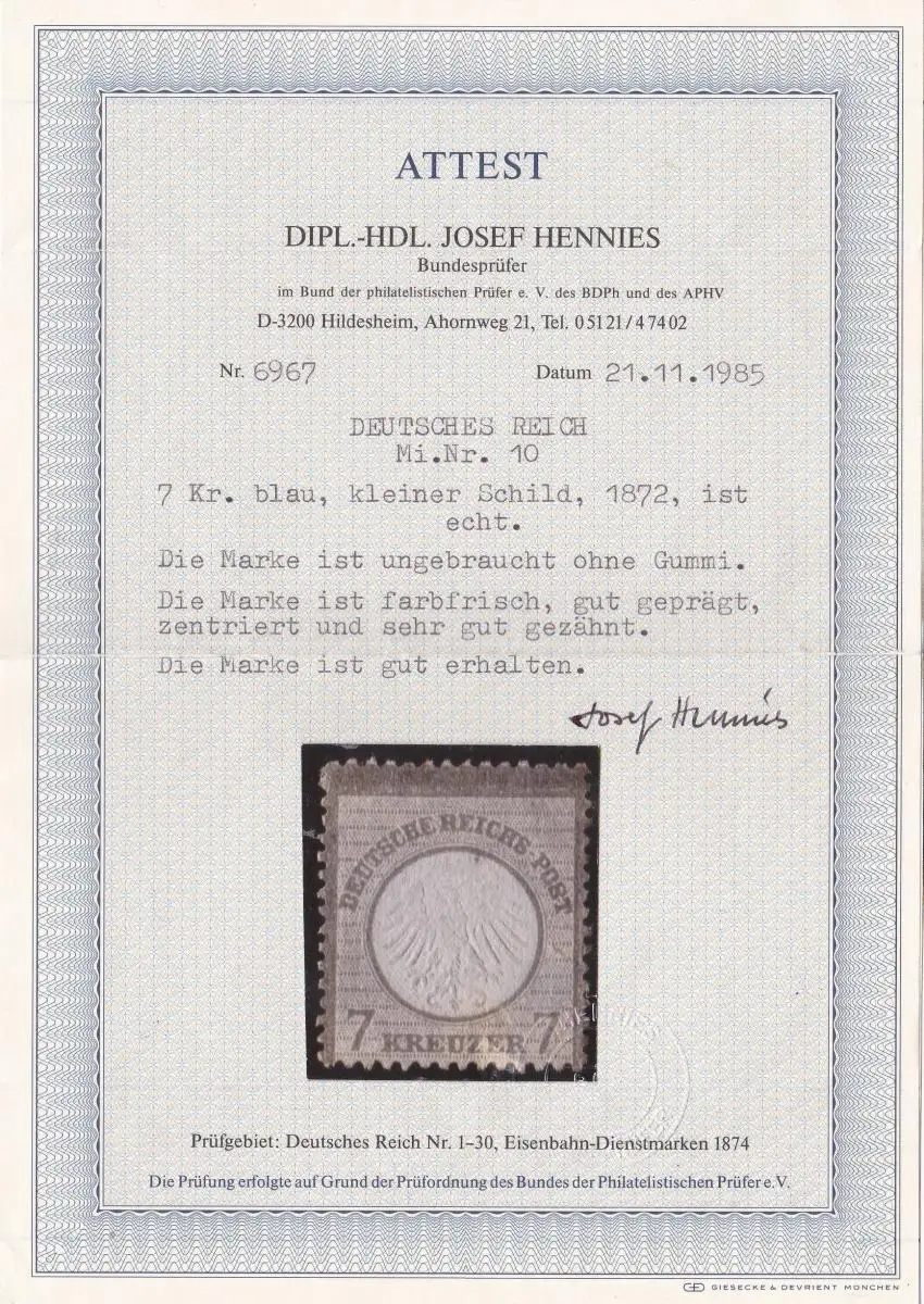 Deutsches Reich: MiNr. 10, BPP Attest, (*)