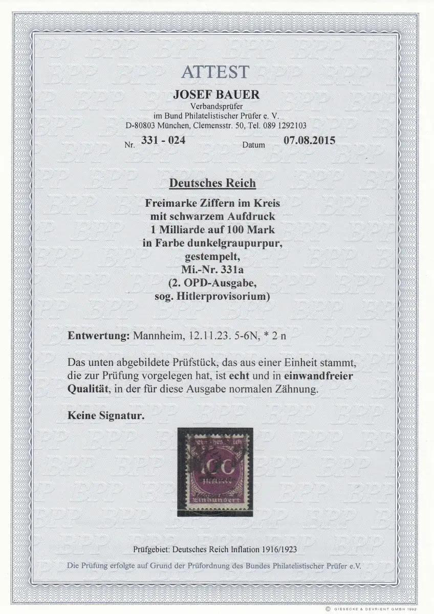 Deutsches Reich MiNr. 331a, gestempelt Mannheim, einwandfrei, BPP Attest
