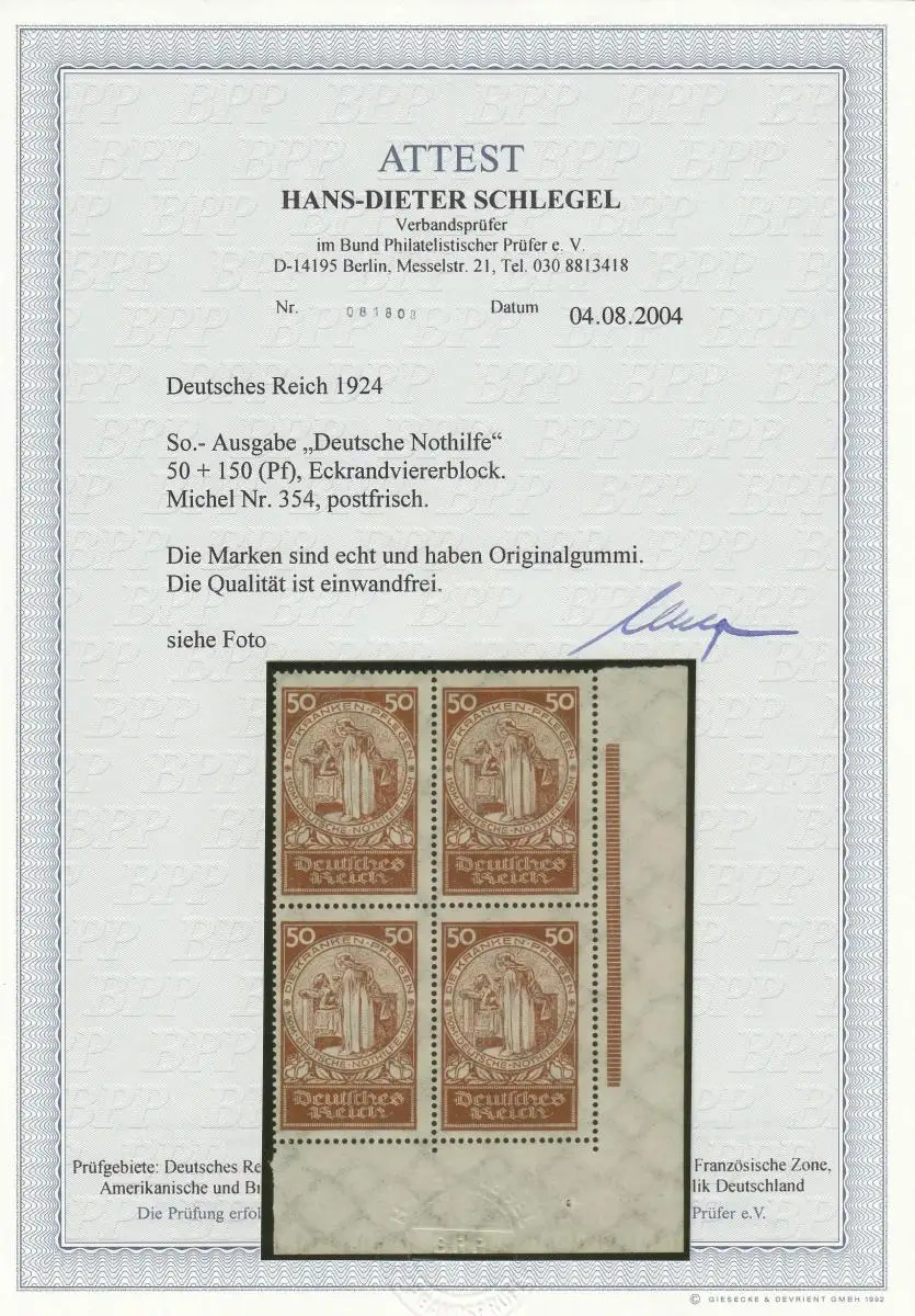 Deutsches Reich, MiNr. 351-54, postfrisch, Eckrand Viererblock, 354 BPP Attest