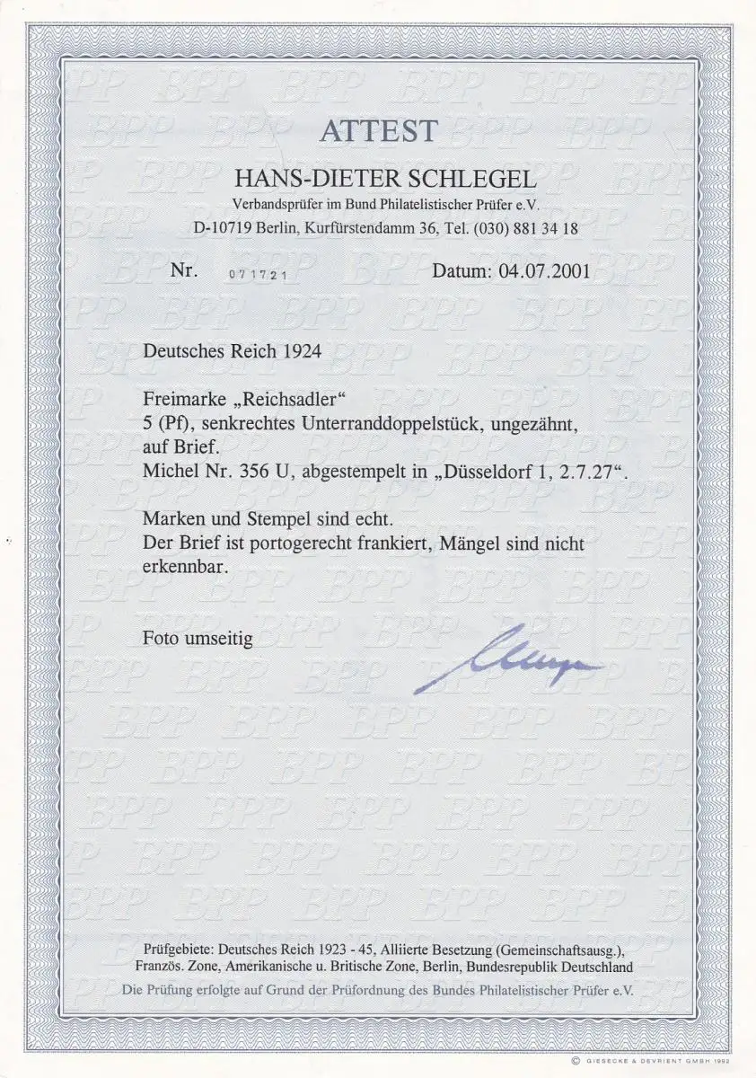 Deutsches Reich: MiNr. 356U, auf Brief, senkr. Unterrandstück, BPP Attest