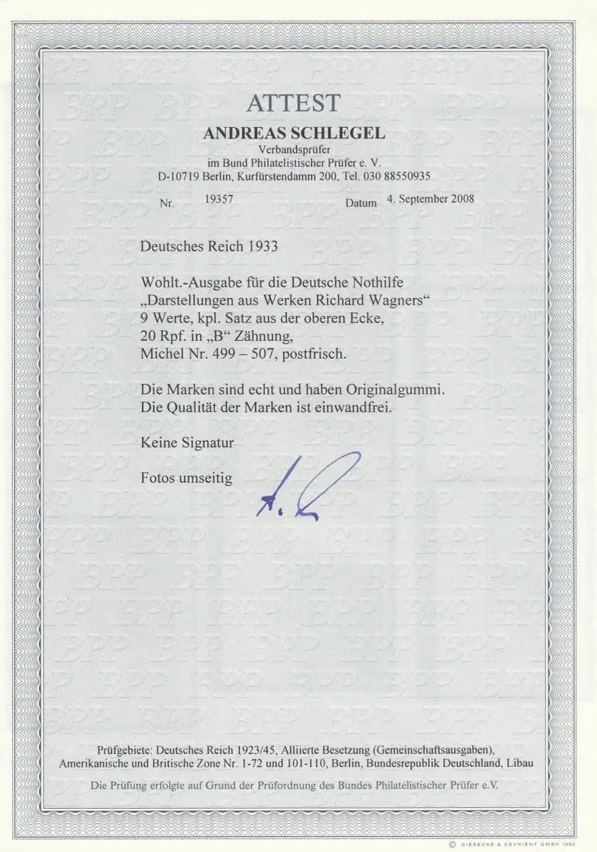Deutsches Reich: MiNr. 499-507, B-Zähnung, postfrisch, BPP Attest