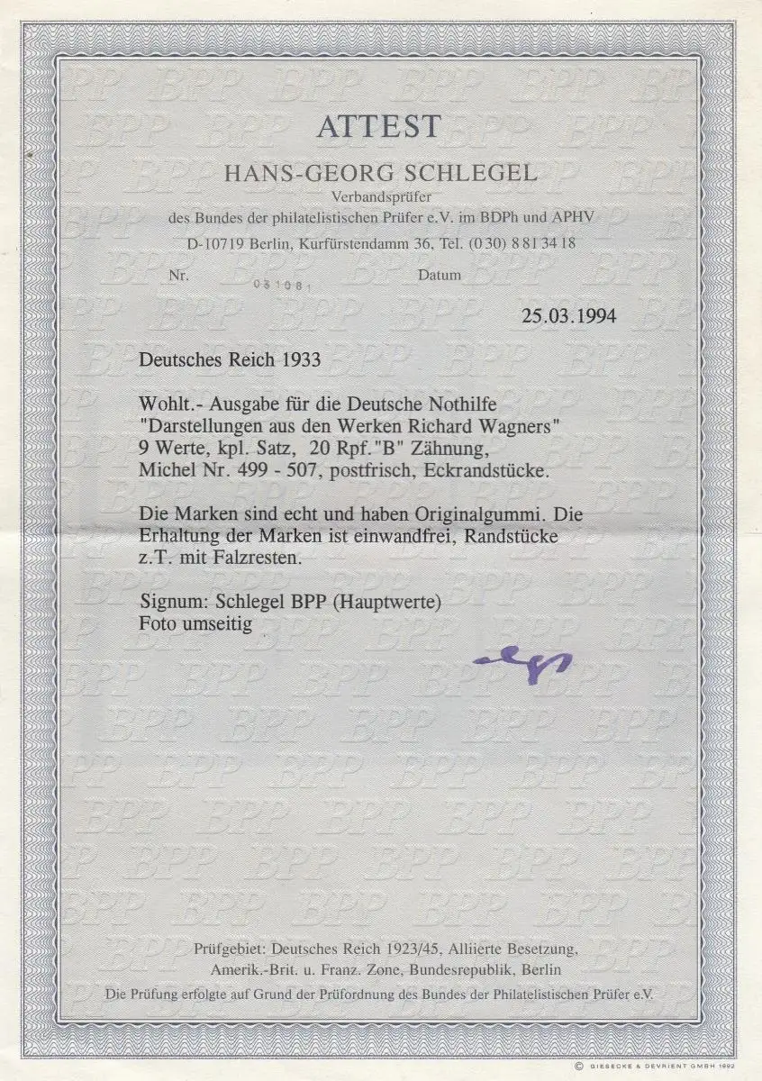 Deutsches Reich: MiNr. 499-507, B-Zähnung, postfrisch, BPP Attest, ECKRAND
